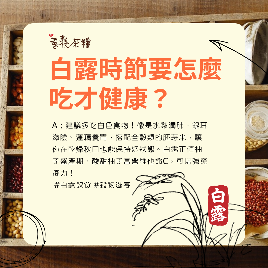 白露時節要怎麼吃才健康? A:建議多吃白色食物!像是水梨潤肺、銀耳滋陰、蓮藕養胃,搭配全穀類的胚芽米,讓你在乾燥秋日也能保持好狀態。白露正值柚子盛產期,酸甜柚子富含維他命C,可增強免疫力! #白露飲食 #穀物滋養